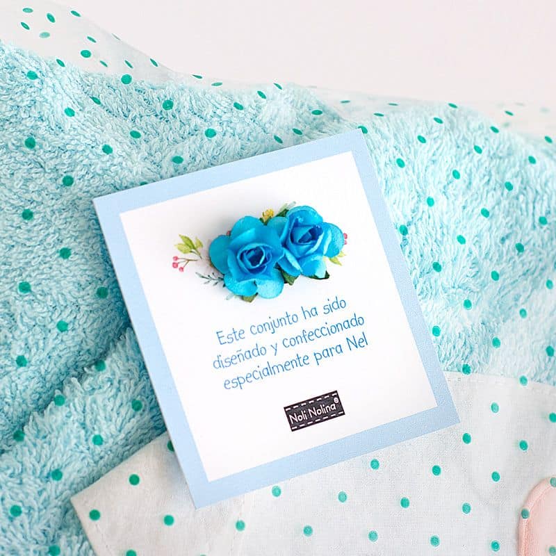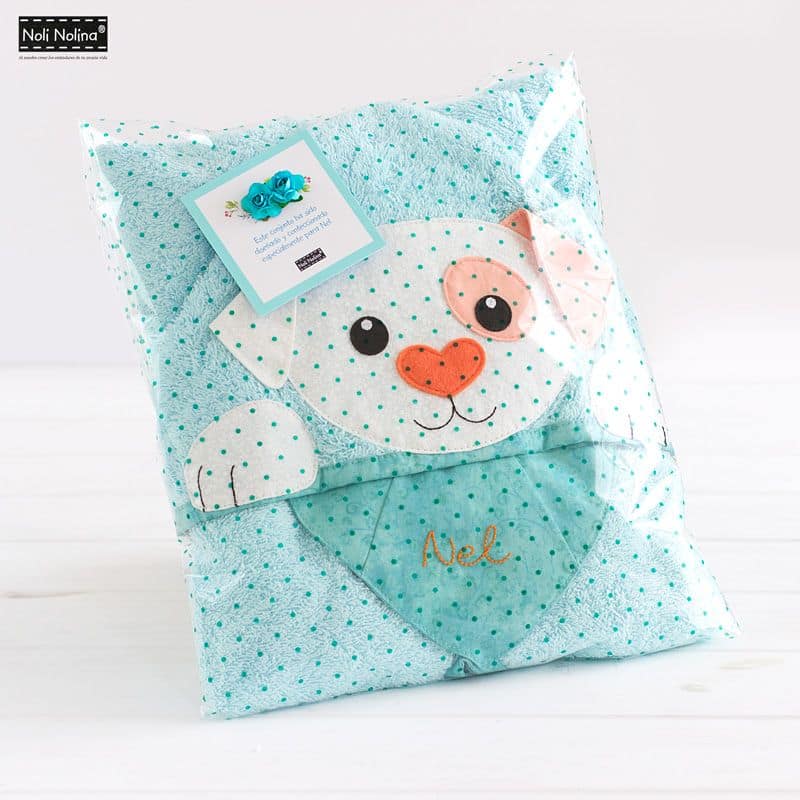 Nel todavía no había nacido cuando me hice cargo de diseñar y confeccionar para él este conjunto compuesto por una capa de baño, manopla y babero personalizado.