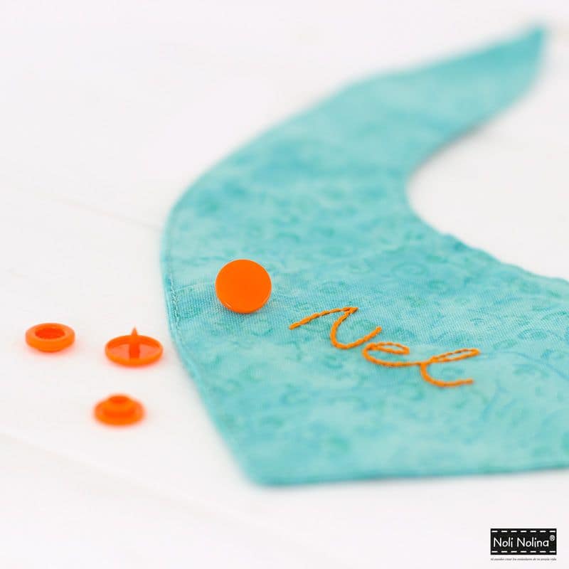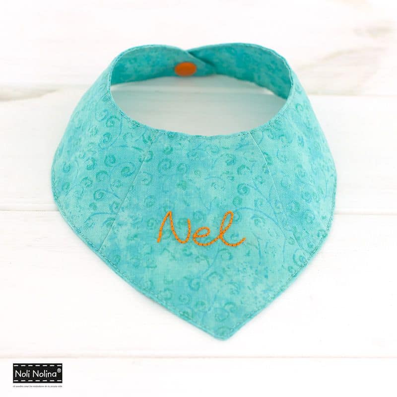 El material empleado para el babero es tela de alta calidad 100% algodón, y el nombre está bordado a mano.