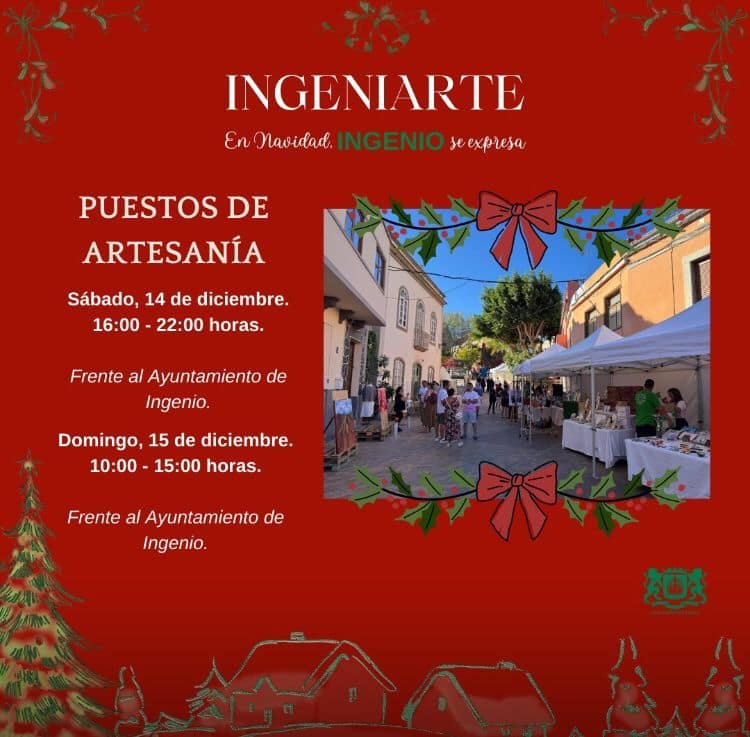 La Villa de Ingenio se prepara para celebrar una Navidad llena de arte y tradición. Entre la variada programación preparada por el Ayuntamiento, se encuentra el evento cultural Ingeniarte 2024 que tendrá lugar del 13 al 15 de diciembre combinando artesanía, música, espectáculos y actividades para toda la familia por el casco de Ingenio.
