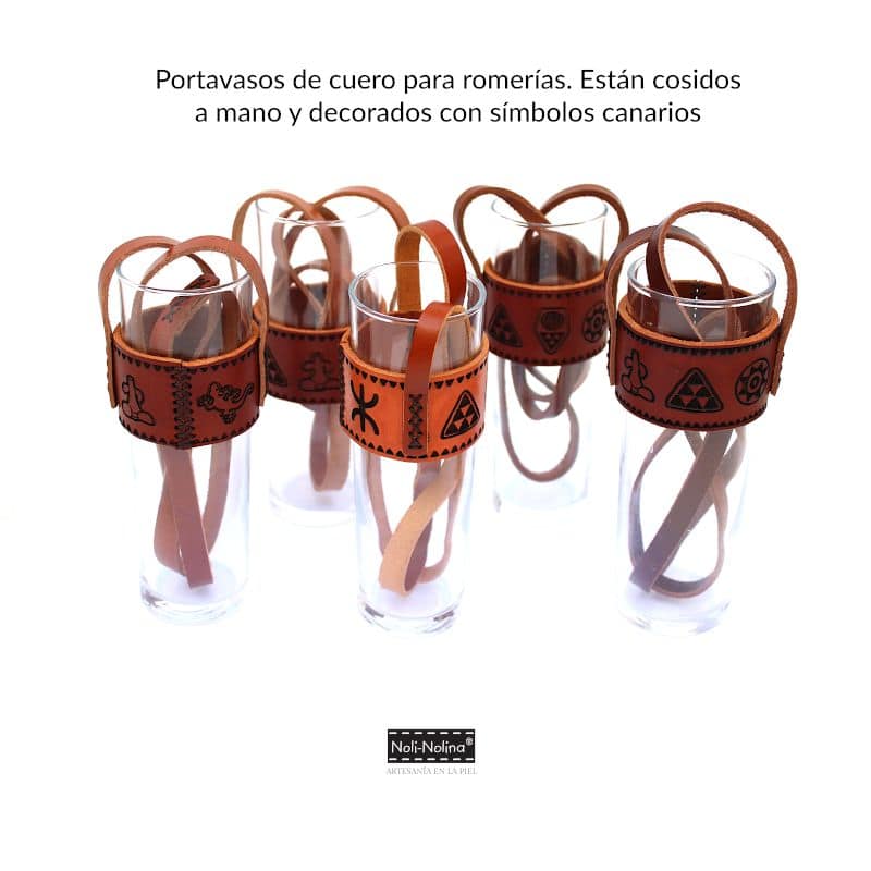 Estos portavasos de cuero para romerías están cosidos a mano y decorados con símbolos canarios.