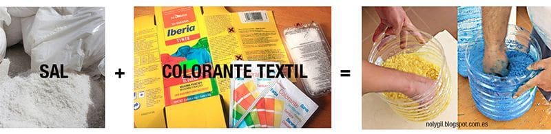 El siguiente paso fue teñir la sal con colorante textil (al que no hizo falta añadir agua), calculando a grosso modo la cantidad que creíamos que nos iba a hacer falta:
