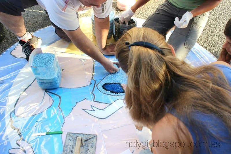 Tras aceptar la invitación nos pusimos manos a la obra con los preparativos previos y empecé por buscar un lema apropiado y una imagen que lo representara y que l@s alumn@s la pudieran colorear en clase; el dibujo que obtuviera más votos sería el que trasladaríamos a la plantilla de 2m x 2m. Me pareció buena la idea de que dicha plantilla ya contara con los colores definitivos porque nos serviría de guía a la hora de rellenar con sal y en el caso de que no nos diera tiempo de terminar la alfombra se vería el dibujo igualmente.
